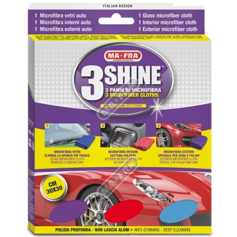Il panno microfibra auto, infatti, possiede caratteristiche di altissimo potere assorbente, proprietà date dalla sua struttura composta da milioni di sottili filamenti, che possono lavorare in profondità eliminando le molecole dello sporco.L’alta performance delle microfibre tecnologiche non è paragonabile a quella di nessun altro materiale, in quanto le fibre dei panni sono incredibilmente morbide, resistenti e con un’elevata assorbenza.MA-FRA ha quindi realizzato un’offerta completa di panni in microfibra auto, pensati per la pulizia di ogni singola parte della vostra auto.Ecco perchè 3Shine è una colleziona completa, formata da ben tre panni auto.All'interno della confezione troverete infatti il panno auto blu, quello rosso e il panno auto viola.A seguire nel dettaglio: - Panno Microfibra auto vetri: Il panno blu, per vetri, elimina lo sporco più tenace senza lasciare aloni.- Panno Microfibra interni: Il panno rosso, per interni, cattura la polvere nelle porosità più profonde del cruscotto - Panno Microfibra esterni: Il panno auto viola, per esterni, facilita la rimozione di cera e polish applicati.Speciale per carrozzerie scure