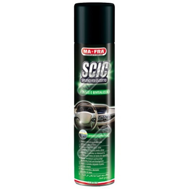 SCIC GREEN è il prodotto lucida cruscotti e per interni auto di MA-FRA studiato per la pulizia cruscotti ad azione igienizzante, con effetto anti-fumo, speciale per gli inserti in alluminio.