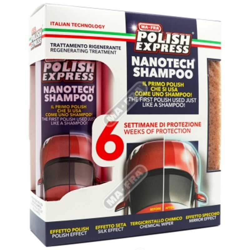 Per questo MA-FRA ha deciso di realizzare un formato speciale ancora più comodo e rapido all'utilizzo: KIT POLISH EXPRESS, un KIT esclusivo che contiene un flacone di POLISH EXPRESS da 250 ml e una spugna adatta al lavaggio manuale e a lucidare ogni tipo di carrozzeria.L'innovazione garantita dalla NanoTechnology di MA-FRA, declinata in POLISH EXPRESS, assicura i 4 effetti Nanotech: EFFETTO POLISH, per una brillantezza inimitabile; EFFETTO TERGICRISTALLO LIQUIDO, per la massima sicurezza in caso di pioggia; EFFETTO SPECCHIO, per donare all’auto il suo aspetto originale e l’unico ed inimitabile EFFETTO SETA, per una carrozzeria davvero liscia e scorrevole al tatto.Un nuovo modo di lucidare l‘esterno auto senza fatica, che garantisce un trattamento specifico e ben 6 settimane di protezione! POLISH EXPRESS è in formato gel, contenuto in un pratico flacone con le indicazioni per la diluizione, in modo tale da permettere un più semplice utilizzo al cliente finale.Un solo flacone basta per il lavaggio di 5 auto.Uno dei prodotti per lucidare l' auto più conosciuti di MA-FRA, realizzati in confezione dedicata, con un prezzo speciale: un prodotto studiato e realizzato al fine di promuovere un KIT pronto all’uso, facile e veloce da utilizzare.Prodotto + spugna per un trattamento rapido ed eccezionalmente performante.Lucidare la carrozzeria auto con KIT POLISH EXPRESS sarà davvero una passeggiata e ti regalerà soddisfazioni uniche! In vendita con un prezzo speciale su Mafra shop.Il Kit Polish Express di MA-FRA è composto da Polish Express nel formato da 250ml e da una Spugna Speciale